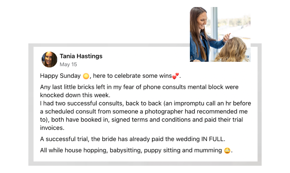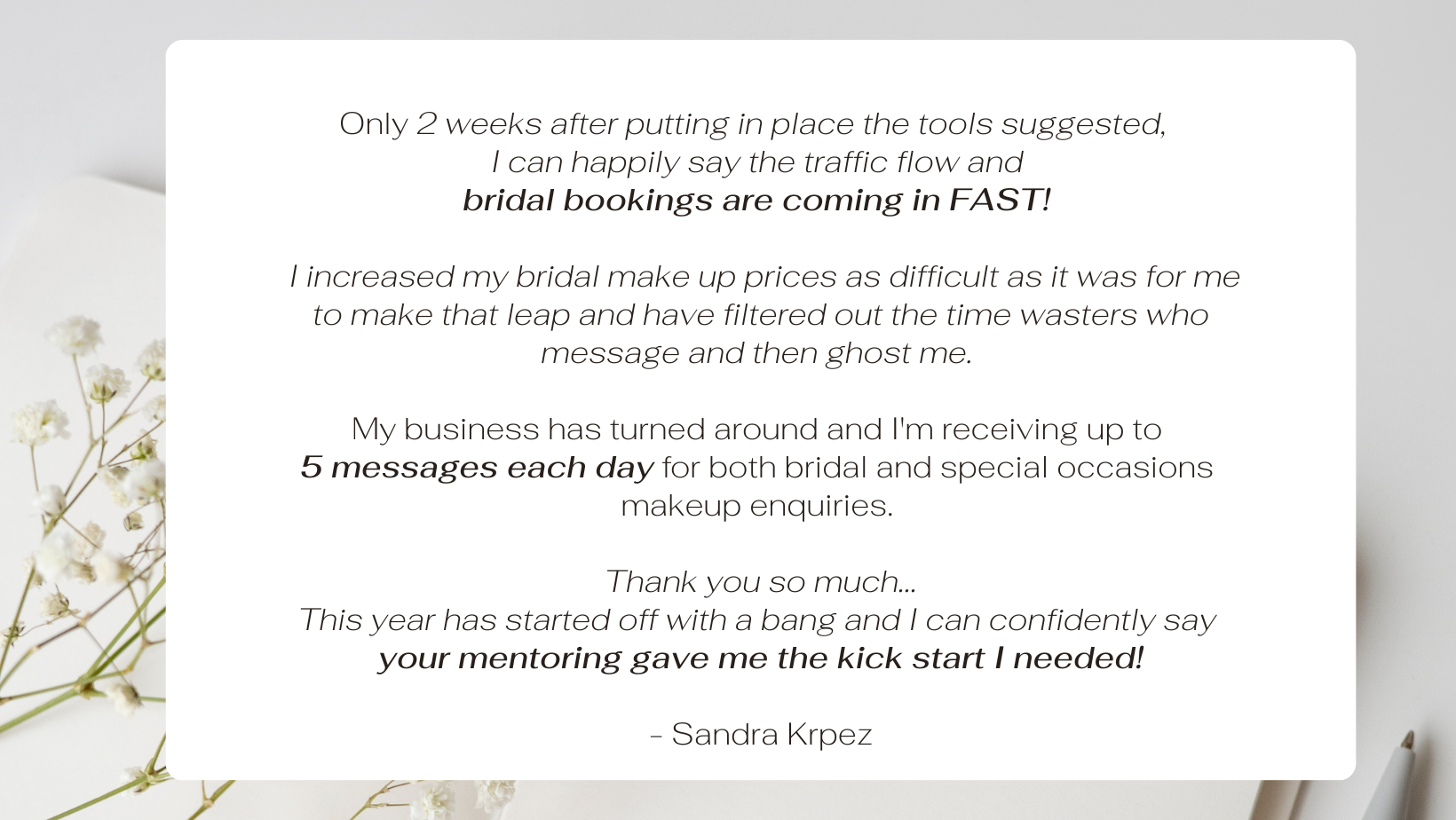 I help overwhelmed and frustrated artists get all the brides they need to earn an extra $2-4k a week working as little as 15 hours. My 20yrs experience as an industry acclaimed Fashion and Bridal Makeup artist means I know how tough it is to navigate through a competitive field and just what strategies you need to overcome the struggle and frustrations to create a profitable and sustainable wedding business.